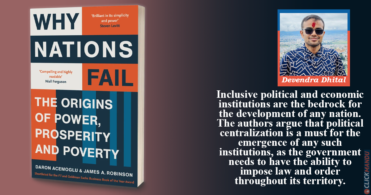 Interestingly, throughout the book, wherever Nepal’s name has been mentioned, it is as an example of a state where there is a lack of enough centralization and government authority for the emergence of such an institution. It is mentioned alongside Afghanistan, Somalia, and Sierra Leone. It is quite arguable whether that is the only or main reason for the underdevelopment of our country.