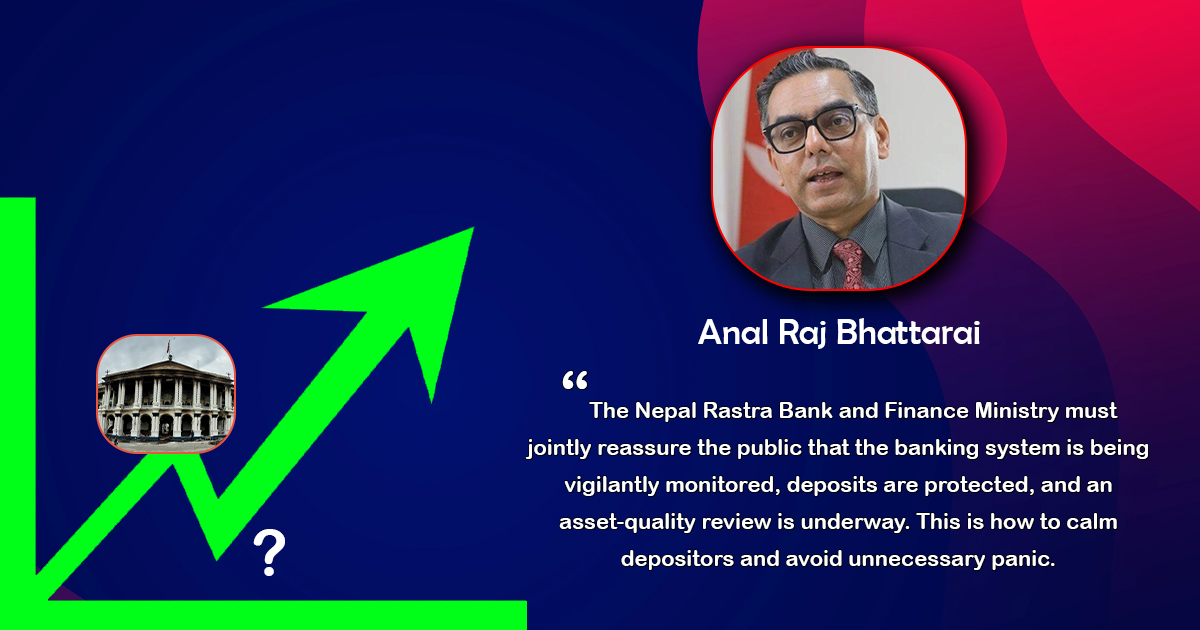 Finally, stability in the financial system cannot be left to speculation. The Nepal Rastra Bank (NRB) and Finance Ministry must jointly reassure the public that the banking system is being vigilantly monitored, deposits are protected, and an asset-quality review is underway. This is how to calm depositors and avoid unnecessary panic.