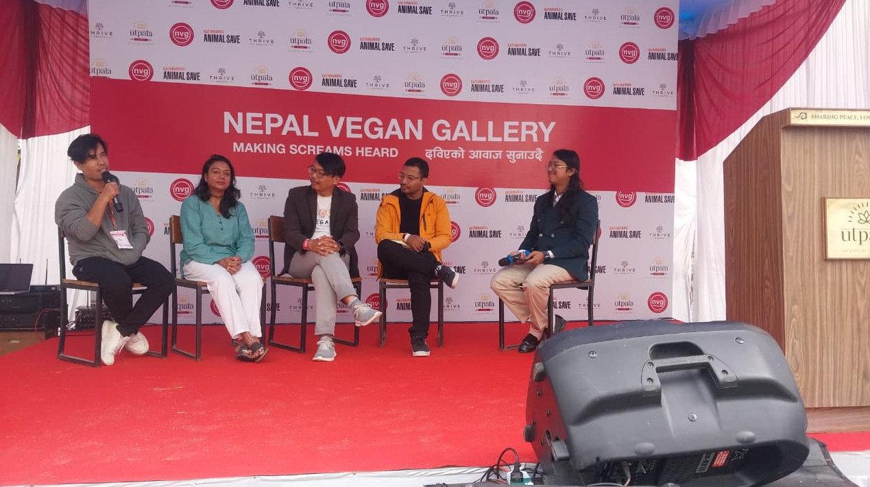 A highlight of the event was a panel discussion titled “Art & Activism,” where speakers including Krishna Gurung, Ravi Thapa, Abish Man Shakya, and Sarita Rajopadhyaya discussed how art can promote compassion and animal rights. Gurung, a veteran vegan artist, shared his 30-year journey toward a lifestyle that benefits animals, nature, and human health.