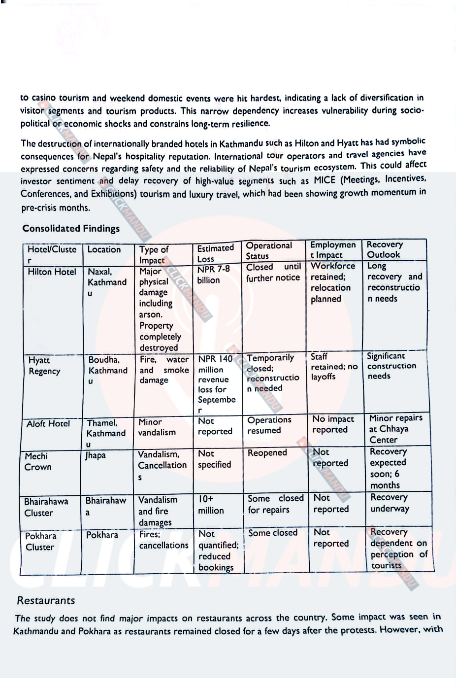 The report also mentions minor damage to Kathmandu’s Barnabas Museum Hotel and Aloft Hotel. According to the findings, hotels in Kathmandu, Pokhara, Bhairahawa, and Jhapa were most severely impacted by the Gen-Z protests.