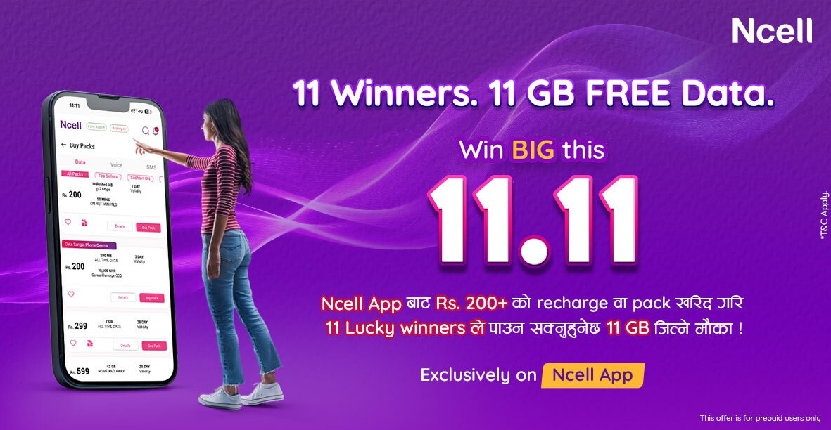 As part of the campaign, 11 lucky customers who recharge or purchase packs worth Rs 200 or more via the Ncell App on Tuesday (November 11) will receive free 11GB data with 11 days validity.