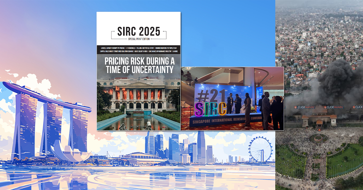 The photo, taken during the violent “Gen-Z protests” on 8–9 September 2025, accompanied the headline of the special SIRC 2025 print edition of (Re)in Asia, the region’s leading insurance intelligence platform.