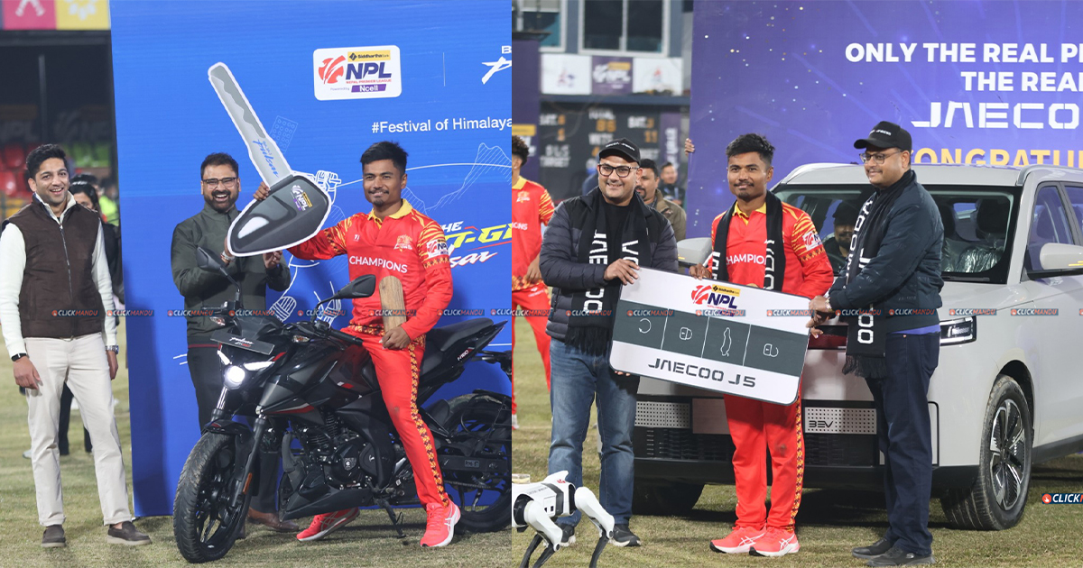 As the top Nepali performer, he received the Omoda E5 electric vehicle valued at Rs 61.99 million, while his strong batting earned him an additional Pulsar motorcycle priced at around Rs 4.2 million, bringing the total prize value to over Rs 66 million.